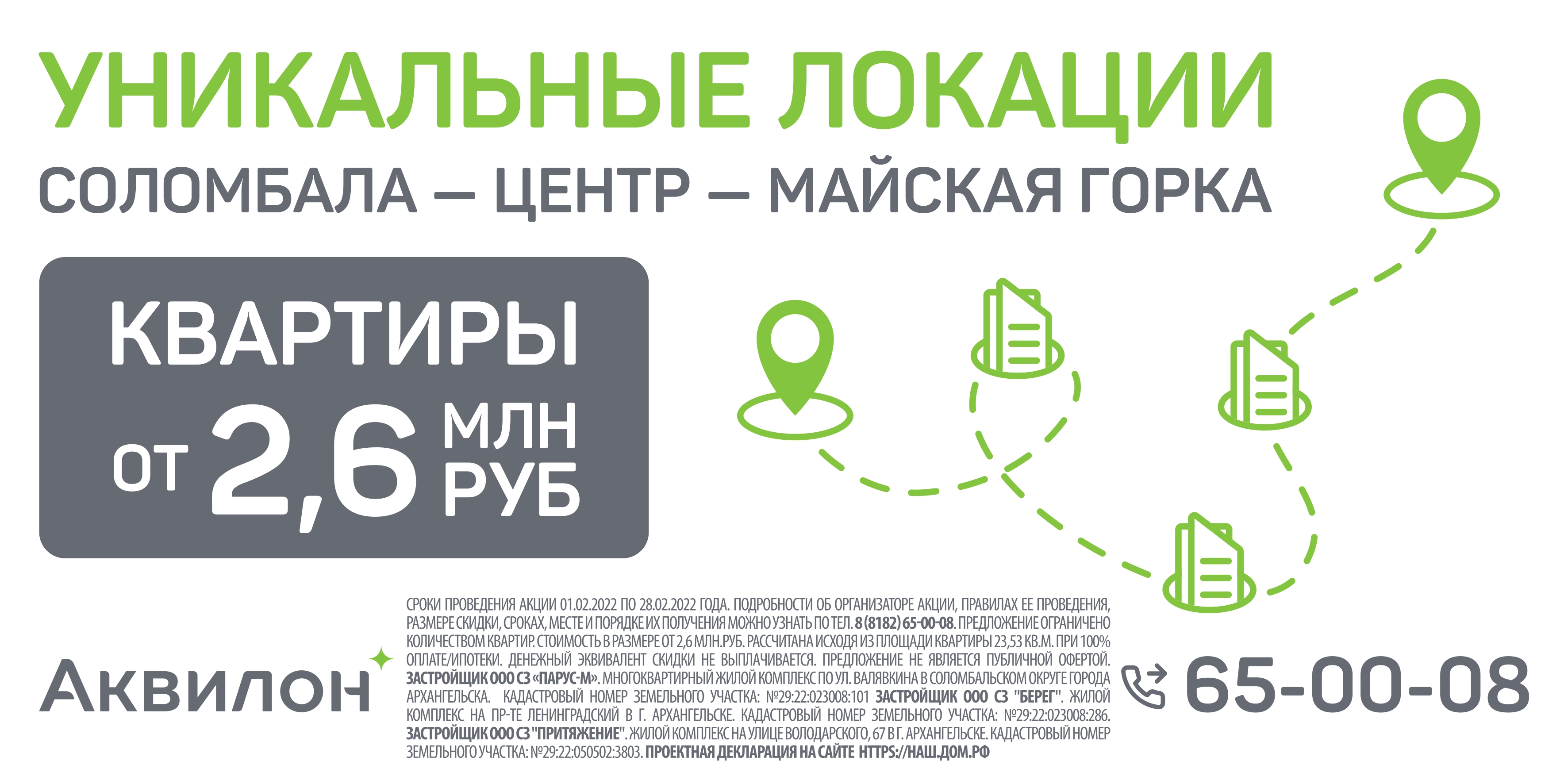 *Сроки проведения акции 01.02.2022 по 28.02.2022 года. Подробности об организаторе акции, правилах ее проведения, размере скидки, сроках, месте и порядке их получения можно узнать по тел. 8 (8182) 63-91-75. Предложение ограничено количеством квартир. Стоимость в размере от 2,6 млн руб. рассчитана исходя из площади квартиры 23,53 кв. м при 100% оплате/ипотеки. Денежный эквивалент скидки не выплачивается. Предложение не является публичной офертой. Застройщик ООО СЗ «Парус-М». Многоквартирный жилой комплекс по ул. Валявкина в Соломбальском округе города Архангельска. Кадастровый номер земельного участка: № 29:22:023008:101 Застройщик ООО СЗ «Берег». Жилой комплекс на пр. Ленинградский в г. Архангельске. Кадастровый номер земельного участка: № 29:22:023008:286. Застройщик ООО СЗ «Притяжение». Жилой комплекс на улице Володарского, 67 в г. Архангельске. Кадастровый номер земельного участка: № 29:22:050502:3803. Проектная декларация на сайте https://наш.дом.рф