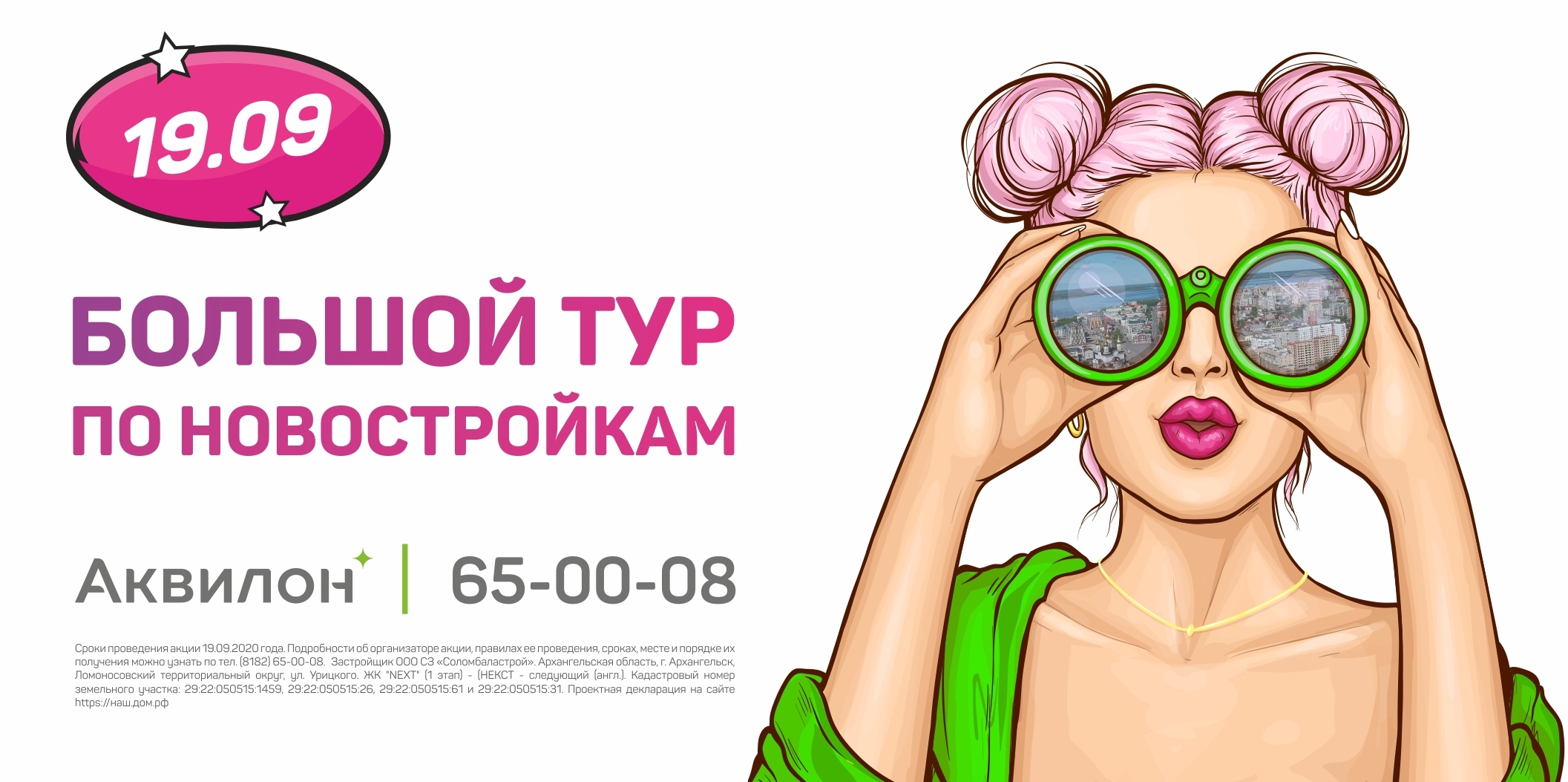 *Сроки проведения акции 19.09.2020 года. Подробности об организаторе акции, правилах ее проведения, сроках, месте и порядке их получения можно узнать по тел. (8182) 65-00-08 и (8184) 52-00-00. Застройщики: ООО СЗ «Соломбаластрой». Архангельская область, г. Архангельск, Ломоносовский территориальный округ, ул. Урицкого. ЖК «NEXT» (1 этап) — (НЕКСТ — следующий (англ.). Кадастровый номер земельного участка: 29:22:050515:1459, 29:22:050515:26, 29:22:050515:61 и 29:22:050515:31; ООО «РЗТ-Инвест». Архангельская область, г. Северодвинск, пр. Беломорский между улицами Лесная и Индустриальная. Кадастровый номер земельного участка: 29:28:102026:10. Проектные декларации на сайте https://наш.дом.рф