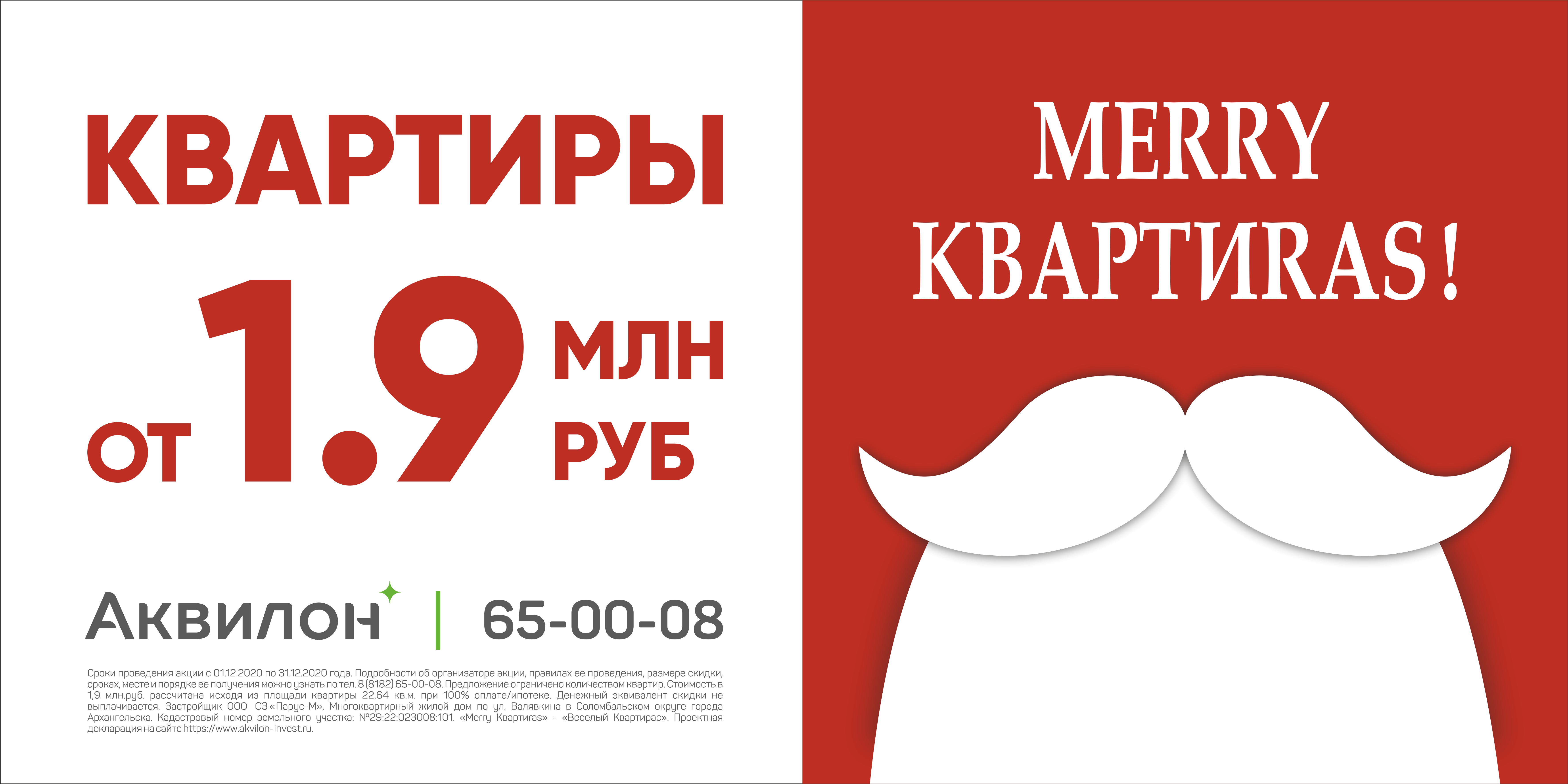 *Сроки проведения акции с 01.12.2020 по 31.12.2020 года. Подробности об организаторе акции, правилах ее проведения, размере скидки, сроках, месте и порядке ее получения можно узнать по тел. 8 (8182) 65-00-08. Предложение ограничено количеством квартир. Стоимость в 1,9 млн.руб. рассчитана исходя из площади квартиры 22,64 кв. м при 100% оплате/ипотеке. Денежный эквивалент скидки не выплачивается. Застройщик ООО «СЗ Парус-М». Многоквартирный жилой дом по ул. Валявкина в Соломбальском округе города Архангельска. Кадастровый номер земельного участка: № 29:22:023008:101. «Merry Квартиras» — «Веселый Квартирас». Проектная декларация на сайте https://www.akvilon-invest.ru.