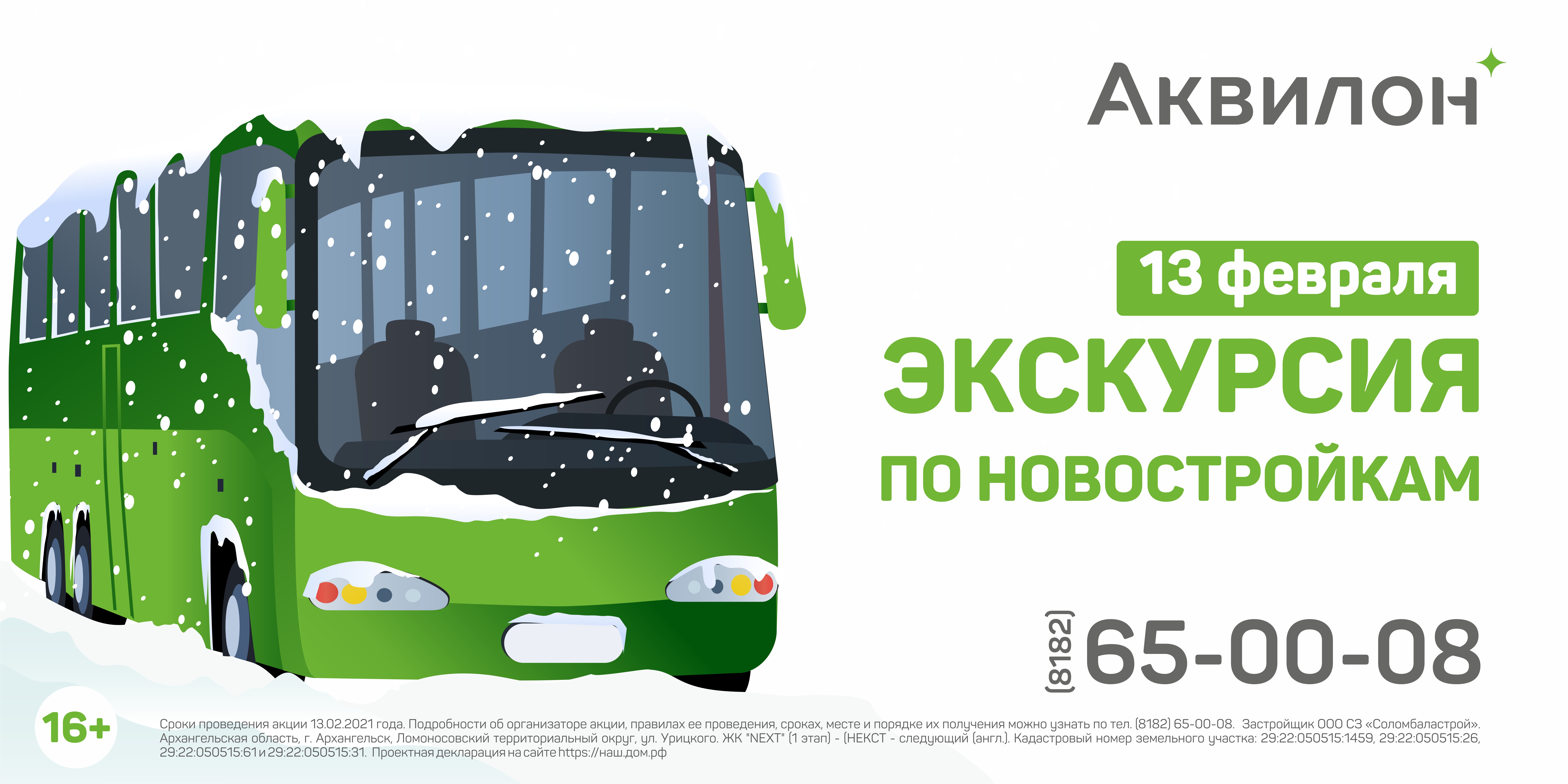 *Сроки проведения акции 13.02.2021 года. Подробности об организаторе акции, правилах ее проведения, сроках, месте и порядке их получения можно узнать по тел. (8182) 65-00-08 и (8184) 52-00-00. Застройщик: ООО СЗ «Соломбаластрой». Архангельская область, г. Архангельск, Ломоносовский территориальный округ, ул. Урицкого. ЖК «NEXT» (1 этап) — (НЕКСТ — следующий (англ.). Кадастровый номер земельного участка: 29:22:050515:1459, 29:22:050515:26, 29:22:050515:61 и 29:22:050515:31; ООО «РЗТ-Инвест». Архангельская область, г. Северодвинск, пр. Беломорский между ул. Лесная и ул. Индустриальная. Кадастровый номер земельного участка: 29:28:102026:10. Проектные декларации на сайте https://наш.дом.рф **Сроки проведения акции с 01.02.2021 по 28.02.2021 года. Подробности об организаторе акции, правилах ее проведения, размере скидок и подарков, сроках, месте и порядке их получения можно узнать по тел. 8 (8182) 65-00-08 и 8 (8184) 52-00-00. Предложение ограничено количеством квартир. Скидка рассчитана исходя из площади квартиры: 81,33 кв. м в Архангельске и 75.84 кв. м в Северодвинске, при 100% оплате/ипотеке и исходя из стоимости отделки 8000 руб./кв.м. Ремонт квартиры — стандартная чистовая отделка от застройщика в одном из 3-х цветовых решений на выбор клиента. Ремонт и скидка до 650 000 руб. в Архангельске и 600 000 в Северодвинске не суммируются. Денежный эквивалент скидок и подарков не выплачивается. ЖК «Зеленый квартал-2». Официальный продавец ООО «Новый отель» (ИНН 7810690450, ОГРН 1177847197307). Адрес объекта: Архангельская обл., г. Архангельск, Октябрьский территориальный округ, в границах проспекта Ломоносова и улицы Гайдара. Застройщик ООО СЗ «Аквилон Недвижимость». Многоквартирный жилой дом по ул. Орджоникидзе в городе Северодвинске. Кадастровый номер земельного участка: № 29:28:103090:81. Проектная декларация на сайте https://наш.дом.рф.