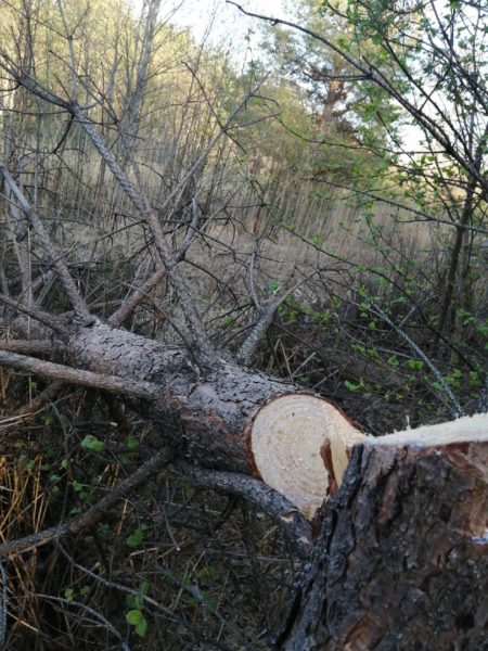 Если конкретнее, то на землях ООПТ «Сосновый бор острова Ягры» в лесополосе рядом с речкой Ягорка обнаружился массовый сосновый запил. Некто, вероятнее всего, вооруженный бензопилой, спилил около десятка деревьев и просто побросал стволы в лесу.