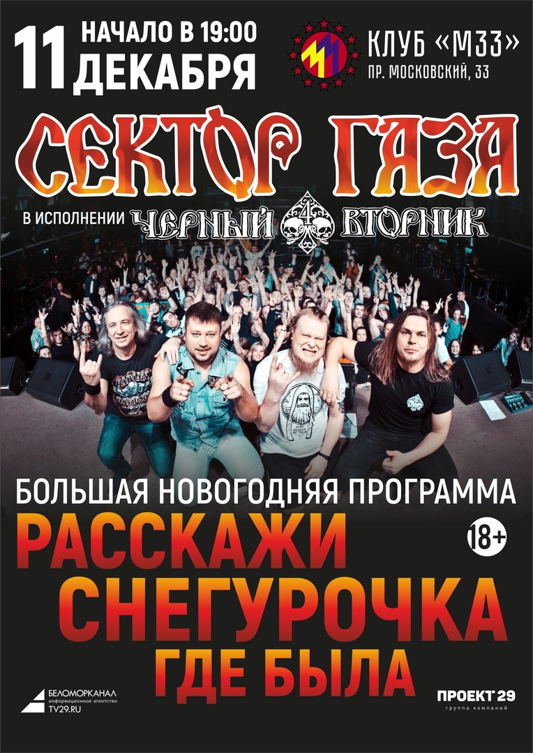 Концертное агентство «Проект 29» представляет: большой, сольный концерт группы Сектор Газа — ЧЁРНЫЙ ВТОРНИК с новогодней программой: «Расскажи Снегурочка, где была!» 11 декабря в клубе «М33» в Архангельске: билеты уже в продаже.